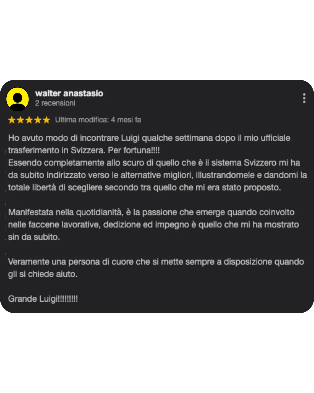 In un solo anno ho fatto recuperare e mettere in tasca oltre mezzo milione di franchi a italiani che avevano dimenticato contributi sparsi in Svizzera, oltre a farli risparmiare tasse e semplificare la loro burocrazia.